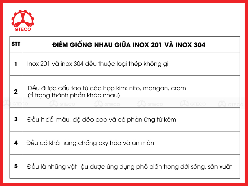 Dưới đây là bảng so sánh điểm giống, khác nhau cũng như cách phân biệt giữa inox 201 và inox 304.